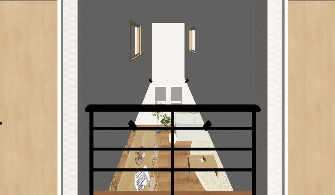 吹き抜けに設けた小窓が、2階と1階をやさしくつなぎます。