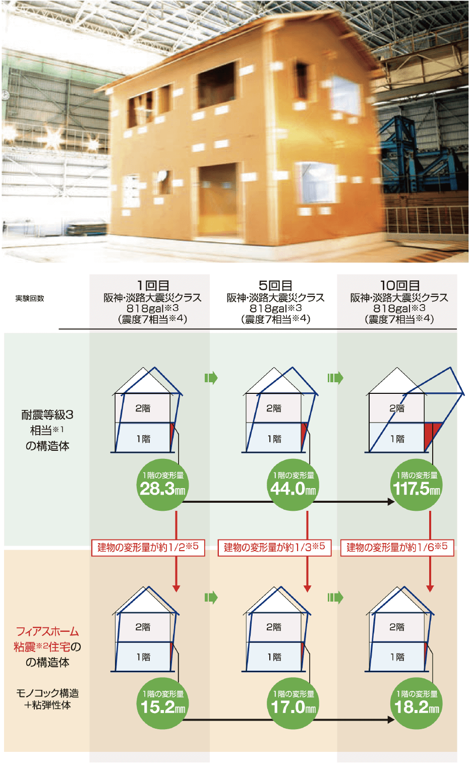 阪神・淡路大震災クラスの大きな揺れと、その余震を想定した実物大実験を防災科学技術研究所にて行い、フィアスホームの地震に対する高い安全性を実証しました。 1.繰り返しの地震に強い実験1回目と実験10回目の建物の変形量の差は、耐震等級3相当の構造体では+89.2mm(28.3mm→117.5mm)に対し、 2.建物の変形量が約1/2実験1回目の建物の変形量は、耐震等級3相当の構造体では28.3mm。 |